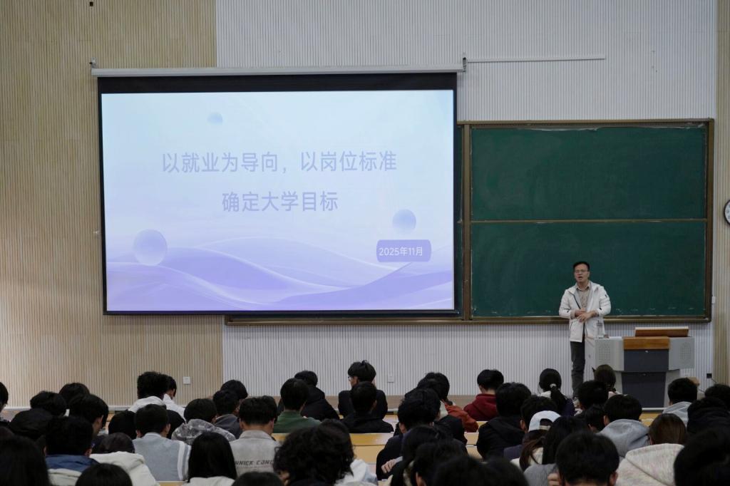 讲座上,吴海亮首先围绕“岗位需求”进行拆解,详细说明了招聘标准,并强调同学们在大学阶段应注重硬技能的积累与软素养的提升。紧接着他结合当前行业发展趋势、企业用人需求及从业者的实践经验,引导学生根据自身兴趣与能力合理地规划学业生涯与职业发展之路,理性看待升学与就业的关系,树立“以岗定标”的发展理念。随后,吴海亮通过真实案例,系统讲解了简历撰写技巧、面试应对策略等实用求职知识,鼓励学生提早开启职业规划,及时关注行业动态,抢占就业发展先机。学生们纷纷表示,此次讲座让他们对未来就业形势有了更清晰的认知,也为个人学习规划与职业发展方向树立了明确目标。